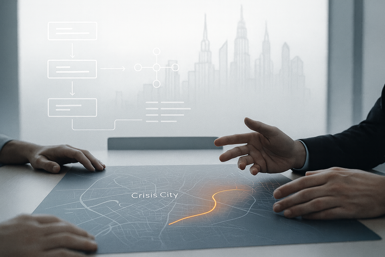 Crisis City is a next-generation crisis performance system — combining high-consequence simulation, measurable behavioural insight, and a proprietary decision-making framework to strengthen how organisations respond under pressure.